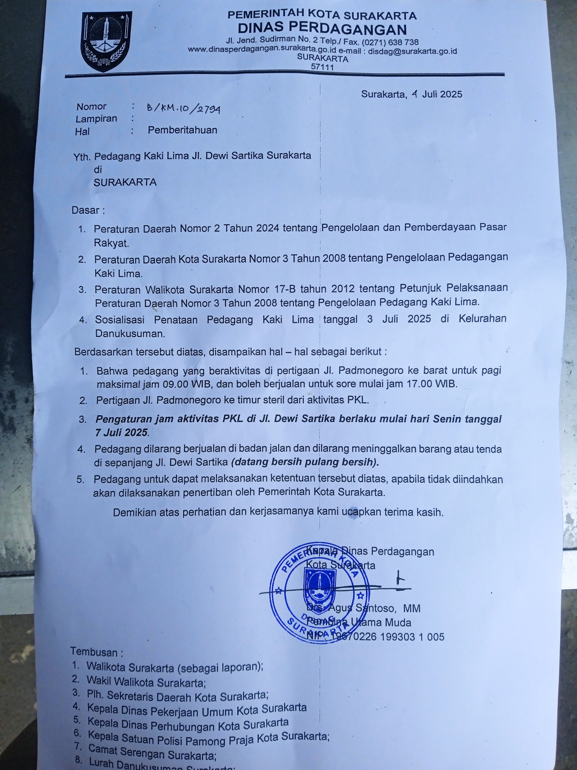 Pak saya mau menyampaikan keluhan saya, kami pedagang kaki lima di jl dewi sartika, mengapa sekarang ada aturan maksimal jualan jam 9, tolong dievaluasi kembali aturan tsbt, dan diberi kelonggaran toleransi, karena jl tersebut bukan jalan utama (melainlan jl alternatif) dan sebaiknya @disdag.surakarta menata rapi pkl di jl tersebut, kalo alasan kemacetannya tolong dicek langsung tkp,pusat kemacetan di pasar... Kami PKL INGIN BERMUSYAWARAH DENGAN SAMPEAN PAK😢